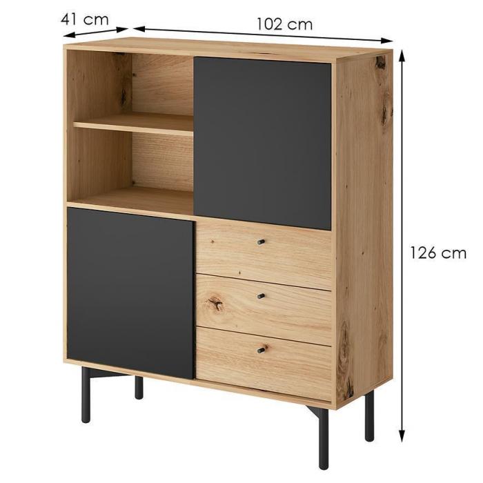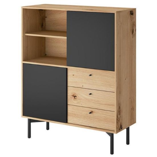 Regał Flow to praktyczny regał, który sprawdzi się nie tylko do pokoju dziennego czy przedpokoju, ale również do innych pomieszczeń, jak na przykład biuro. Regał można przeznaczyć na książki, segregatory oraz inne dowolne przedmioty. Mebel wykonany został z płyty wiórowej laminowanej. Regał w kolorze dąb artisan/czarny perlisty. Do kompletu można dokupić inne meble z kolekcji.