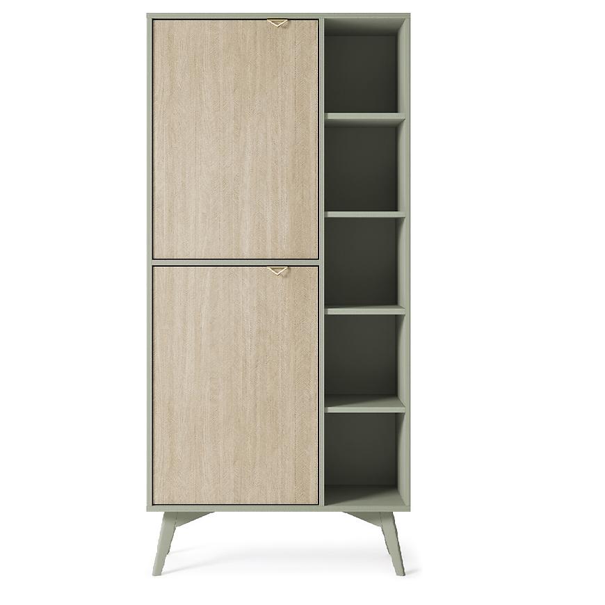 Fronty regału w przyjemnym odcieniu jodełki scandi dodają mu lekkości i subtelnego uroku, harmonijnie współgrając z eukaliptusowym kolorem korpusu. Matowe wykończenie nadaje regałowi eleganckiego wyglądu, podkreślając jego nowoczesny charakter, jednocześnie zapewniając łatwe utrzymanie w czystości.