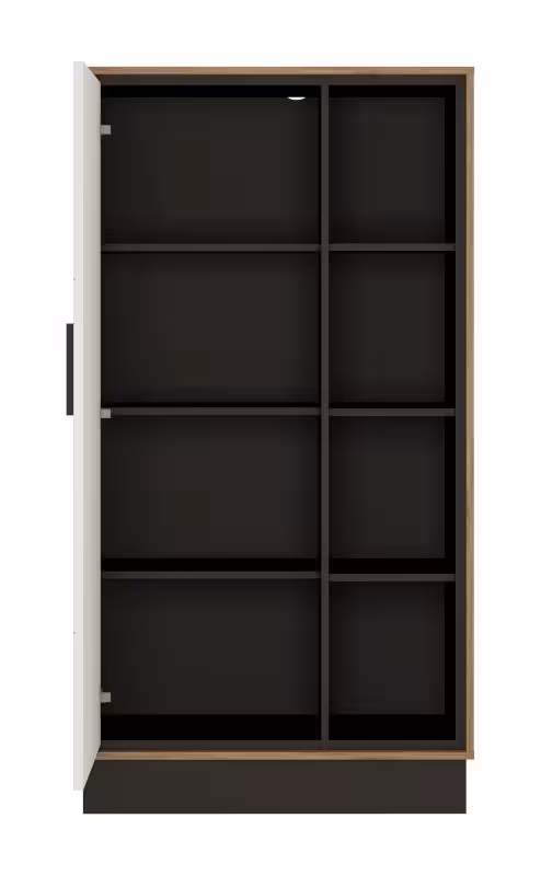 Za pełnymi drzwiami regału znajduje się praktyczna przestrzeń do przechowywania, która ułatwia utrzymanie porządku i organizację codziennych przedmiotów. Starannie zaprojektowane wnętrze pomieści książki, dokumenty, zastawę lub inne akcesoria domowe. Zawiasy z cichym domykiem zapewniają komfortowe użytkowanie, a subtelny uchwyt z tworzywa podkreśla nowoczesną estetykę mebla.