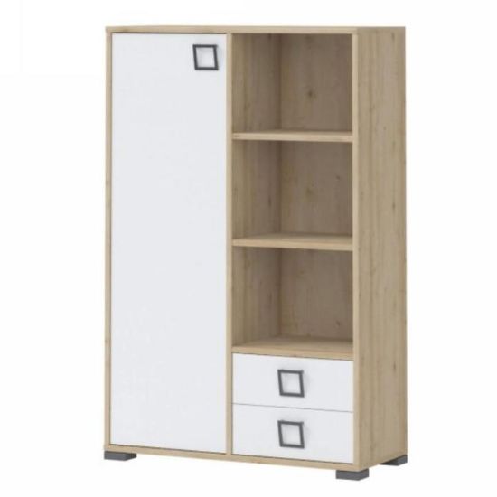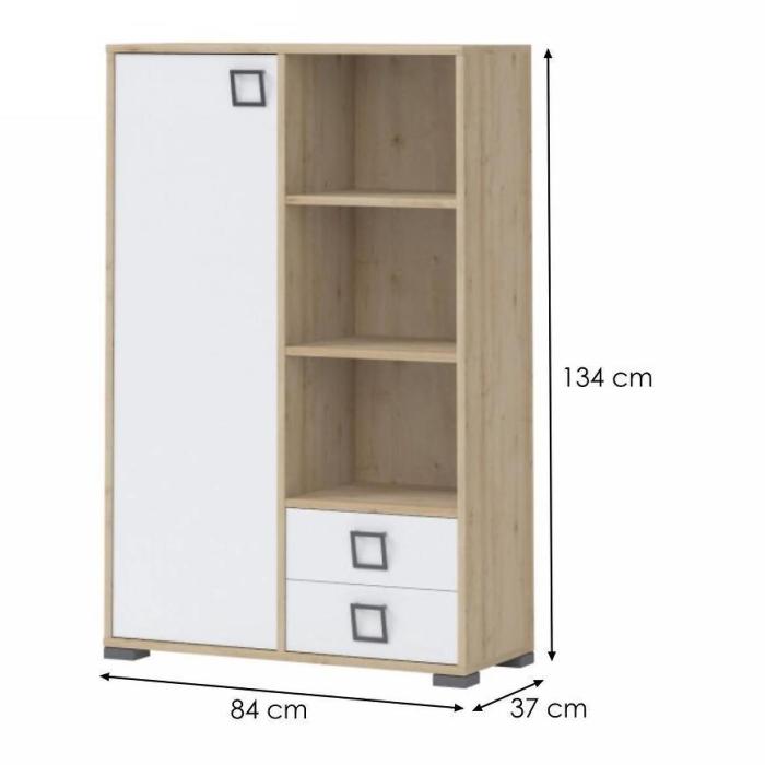 Wykonany w jasnych kolorach idealnie uzupełni aranżacje w pokoju młodzieżowy, a takze w salonie i pokoju dziennym. Posiada jedną szafkę, dwie szuflady i trzy półki otwarte dzięki, którym uzuskujemy dodatkowe i łatwo dostępne miejsce do przechowywania.