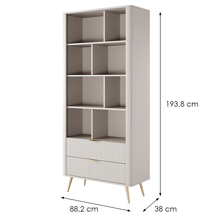 Model o szerokości 88,2 cm, wysokości 193,8 cm i głębokości 38 cm oferuje dużą przestrzeń do przechowywania i ekspozycji. Otwarte półki pozwalają wygodnie uporządkować książki, dekoracje, dokumenty oraz inne przedmioty codziennego użytku.