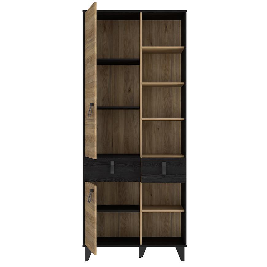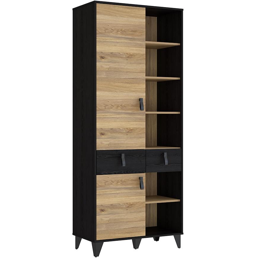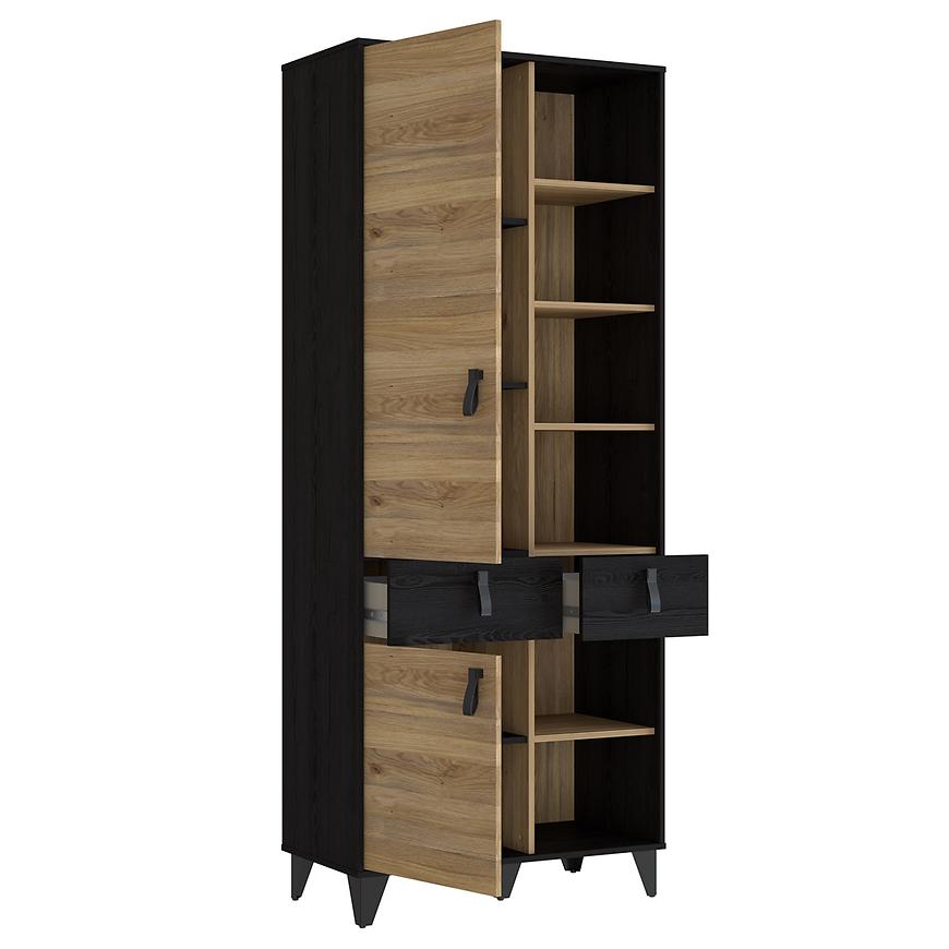 Wybarwienie regału przedstawia jasne drewnopodobne odcienie, a fronty ozdobione są delikatnymi akcentami dębu Mauvella i dębu Cabezone, które nadają meblowi wyrafinowanego wyglądu. Zarówno fronty, jak i korpus, zostały wykończone matową powierzchnią, co podkreśla ich elegancję i trwałość.