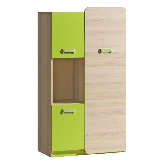 Regał Lorento L5 wyróżnia się niebanalnym wzornictwem i dużą funkcjonalnością. Doskonale sprawdzi się w pokoju dziecięcym lub młodzieżowym. Model ten przyciąga uwagę owalnymi kształtami, nowoczesnym designem oraz wyjątkową kolorystyką. Mebel wykonany został z płyty laminowanej oraz uchwytów z PCV. Połączenie jasnego wybarwienia jesionu coimbra i ciepłą zielenią limonki sprawia, że regał lorento L5 ożywi wnętrze i wniesie do niego światło. Niezwykle praktyczne zastosowanie dwóch mniejszych zamykanych szafek oraz jednej dużej daje sporo przestrzeni do przechowywania. Dodatkowa wnęka to idealne miejsce na ekspozycję wybranych przedmiotów, lub usytuowanie tych, które warto mieć zawsze pod ręką, np. segregatorów lub książek. Model ten mierzy 80 cm szerokości, 40 cm głębokości oraz 144 cm wysokości i przeznaczony jest do samodzielnego montażu.