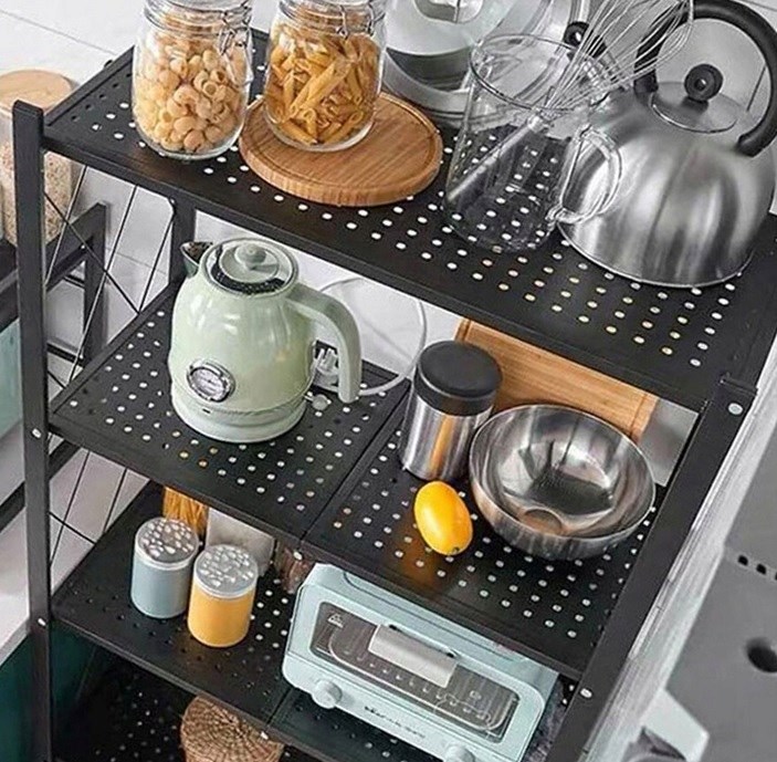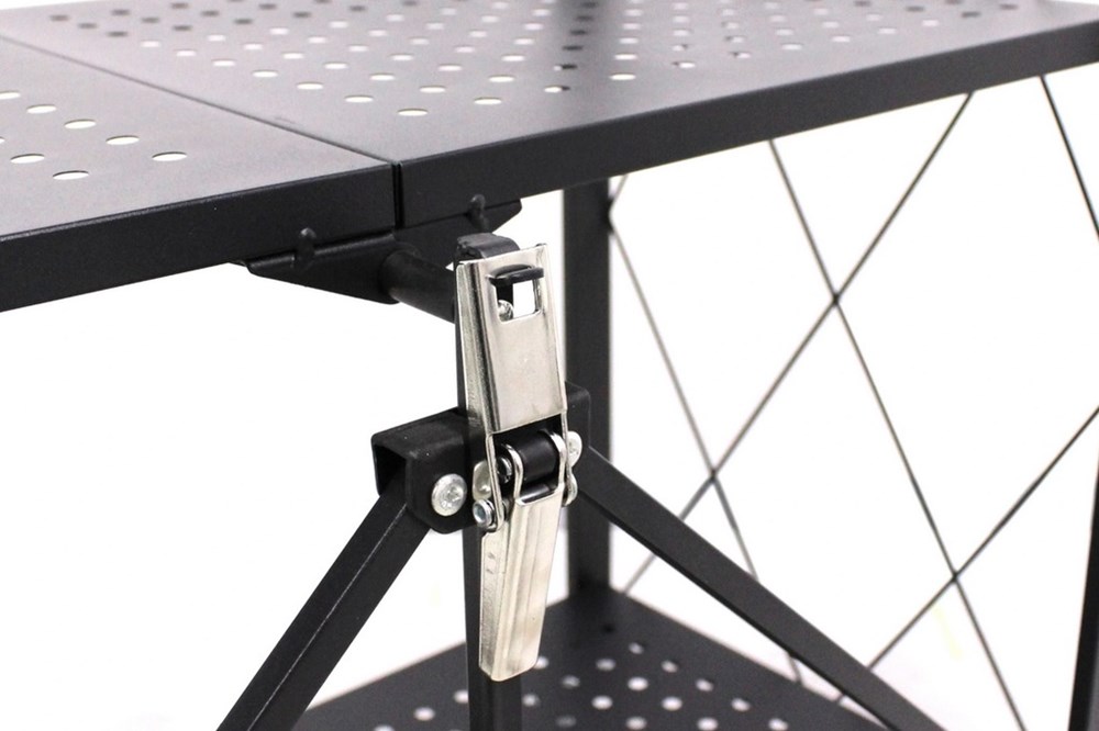 Składany, metalowy regał w stylu loftowym idealnie nada się do kuchni, łazienki, ale też piwny, garażu. Dodatkowym atutem są kółka oraz składne półki, regał ma zatrzask, który umożliwia złożenie i rozłożenie regału. Regał posiada 4 kółka obracające się o 360 stopni, specjalna blokada uniemożliwia samowolne przesunięcie regału przez zablokowanie dwóch kół. Metalowe elementy posiadają plastikowe zaślepki. Dodatkowo góra regału jest otwierana.