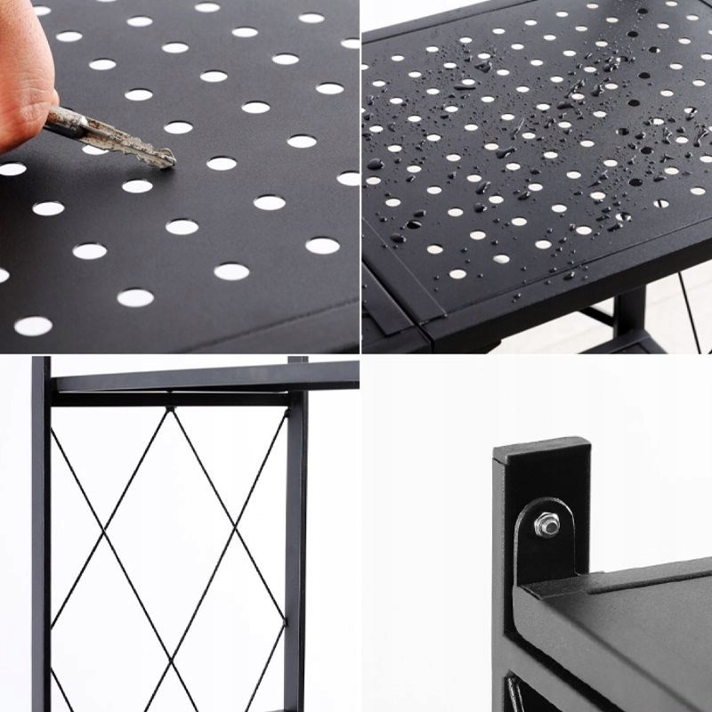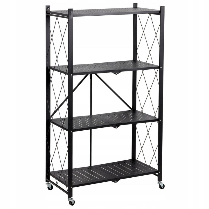 Składany, metalowy regał w stylu loftowym idealnie nada się do kuchni, łazienki, ale też piwny, garażu. Dodatkowym atutem są kółka oraz składne półki, regał ma zatrzask, który umożliwia złożenie i rozłożenie regału. Regał posiada 4 kółka obracające się o 360 stopni, specjalna blokada uniemożliwia samowolne przesunięcie regału przez zablokowanie dwóch kół. Metalowe elementy posiadają plastikowe zaślepki. Dodatkowo góra regału jest otwierana.