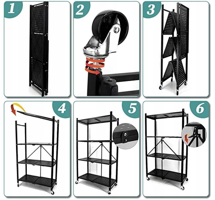 Składany, metalowy regał w stylu loftowym idealnie nada się do kuchni, łazienki, ale też piwny, garażu. Dodatkowym atutem są kółka oraz składne półki, regał ma zatrzask, który umożliwia złożenie i rozłożenie regału. Regał posiada 4 kółka obracające się o 360 stopni, specjalna blokada uniemożliwia samowolne przesunięcie regału przez zablokowanie dwóch kół. Metalowe elementy posiadają plastikowe zaślepki. Dodatkowo góra regału jest otwierana.