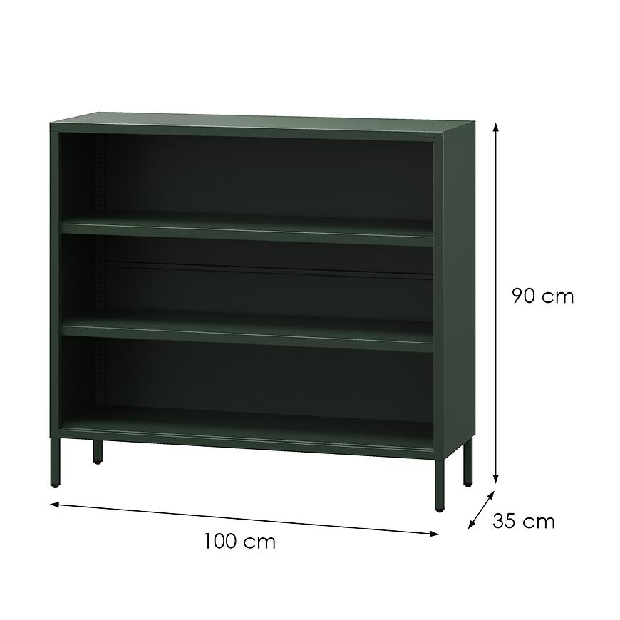 Ten niski regał w głębokim, butelkowozielonym odcieniu to stylowe i praktyczne rozwiązanie wyłącznie do salonu. Wykonany z metalu, łączy nowoczesną formę z trwałością, tworząc idealne miejsce na książki, dekoracje czy pamiątki. Kolor Bottle Green wprowadza do wnętrza elegancję i wyrazisty charakter, doskonale podkreślając nowoczesny styl aranżacji.