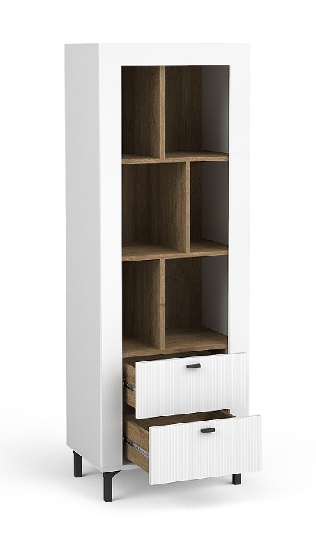 Regał Mossa MO4 jest funkcjonalnym meblem, który łączy w sobie zarówno szuflady, jak i półki. Wyposażony w dwie szuflady, oferuje dodatkową przestrzeń do przechowywania mniejszych przedmiotów, takich jak dokumenty, akcesoria biurowe czy inne drobiazgi, które chcemy mieć pod ręką, ale jednocześnie schowane. Szuflady są płynnie otwierane i zamykane, co zapewnia wygodę użytkowania.