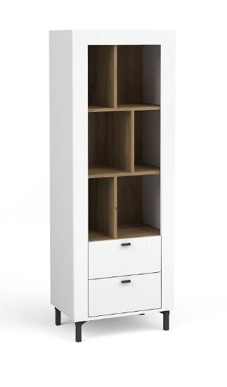 Regał Mossa MO4 charakteryzuje się wysoką jakością wykonania, co gwarantuje trwałość i odporność na codzienne użytkowanie. Korpus regału jest wykonany z płyty meblowej w eleganckim kolorze biały mat. Ten neutralny odcień wprowadza do wnętrza poczucie świeżości i przestronności, a matowe wykończenie jest praktyczne, ponieważ nie widać na nim odcisków palców ani drobnych zarysowań. Fronty regału, które również mają kolor biały mat, zostały wzbogacone o efekt prążkowania. Ten subtelny detal dodaje meblowi nowoczesnego i eleganckiego wyglądu, tworząc ciekawą teksturę, która wyróżnia się na tle gładkich powierzchni.