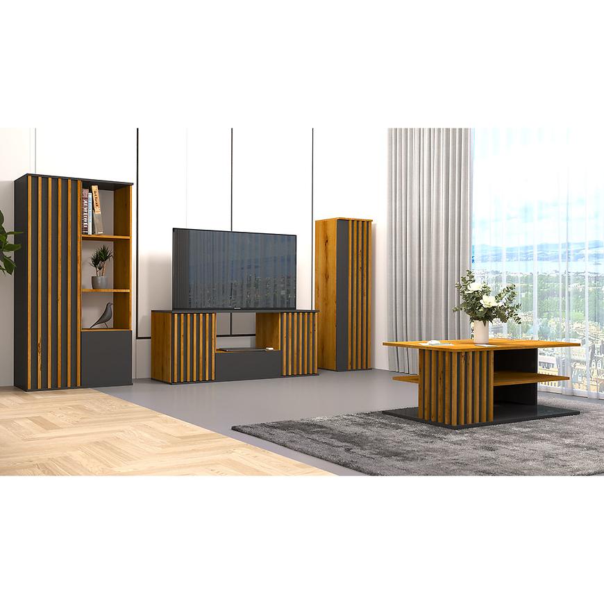 Łóżko z zagłówkiem jest dostępne w dwóch rozmiarach - 160 cm i 180 cm szerokości, zapewniając wygodne miejsce do wypoczynku i relaksu. Szafka RTV dwudrzwiowa z szufladą to funkcjonalne rozwiązanie do przechowywania sprzętu multimedialnego. Regał dwudrzwiowy z półkami stanowi doskonałe miejsce na książki i dekoracje.