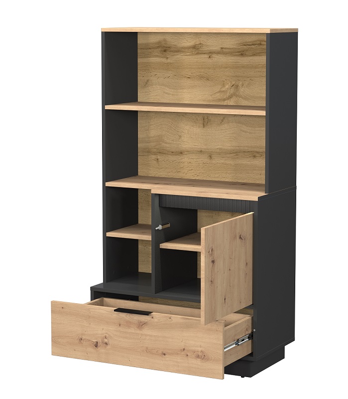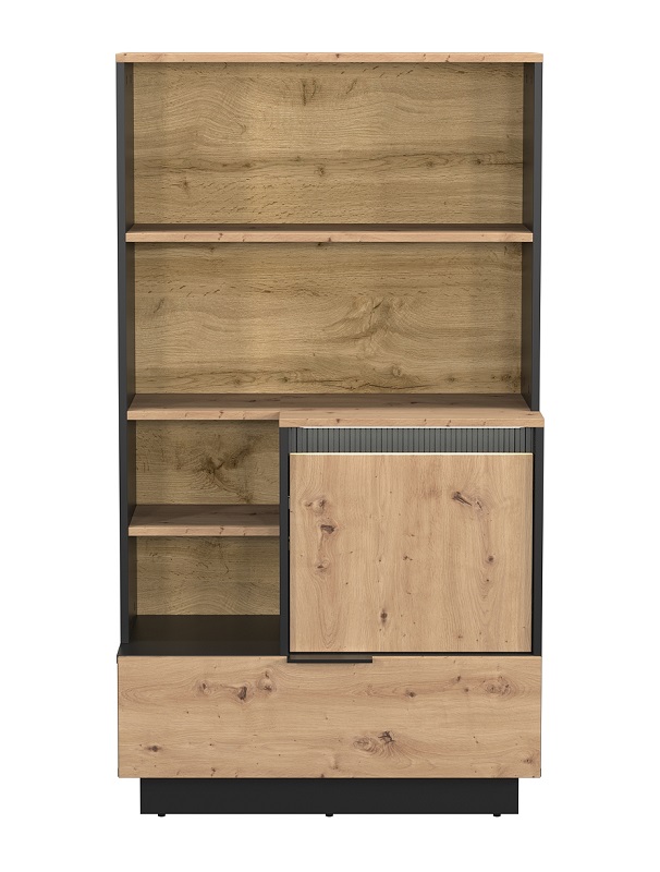 Fronty regału ozdobione są elementami w kolorze czarnym, które dodają całości nowoczesnego stylu i wyrazistości. Uzupełnieniem tego są fronty z ryflowanego MDF-u w kolorze czarnym, które wprowadzają modny, trójwymiarowy efekt. Regał jest jednodrzwiowy, z uchylnymi drzwiami oraz jedną szufladą, co umożliwia wygodne przechowywanie różnorodnych przedmiotów. Dodatkowo, trzy półki oferują przestrzeń na książki, dekoracje czy inne niezbędne akcesoria.