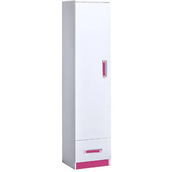 Jednodrzwiowa konstrukcja regału wykonana z solidnej płyty wiórowej laminowanej gwarantuje trwałość oraz stabilność, nawet przy intensywnym użytkowaniu. Pojemne wnętrze pozwala na przechowywanie książek, zabawek, ubrań czy szkolnych akcesoriów, pomagając utrzymać porządek w pokoju dziecka. Kolekcja TRAFIKO wyróżnia się prostą formą i nowoczesnym stylem, dzięki czemu regał doskonale komponuje się z innymi meblami z tej serii, tworząc spójną i estetyczną przestrzeń.