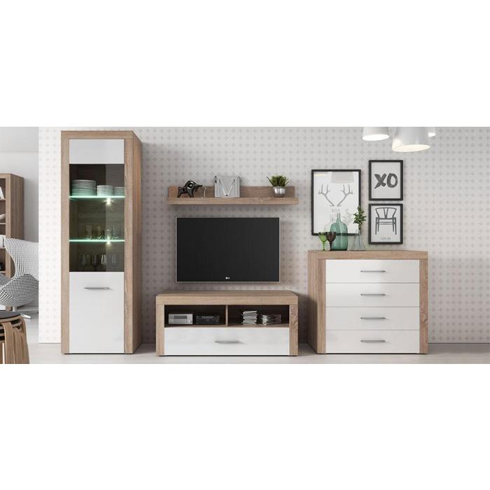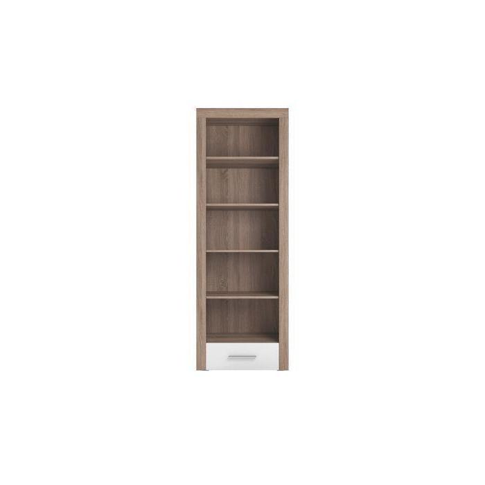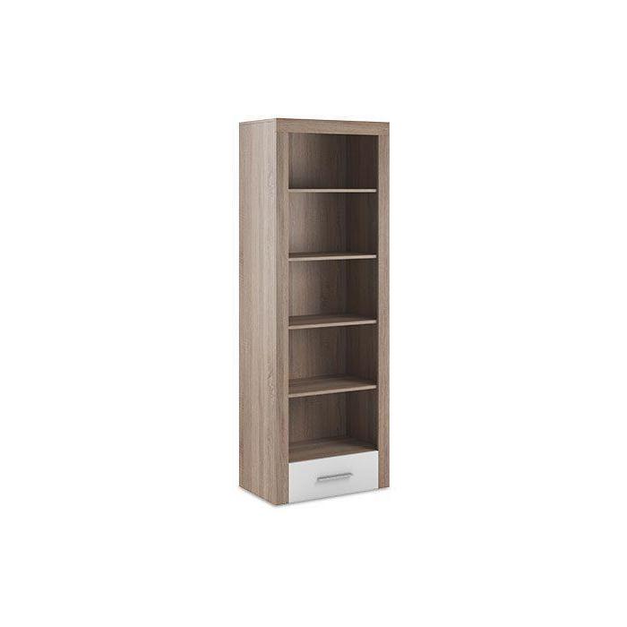 Regał do salonu lub pokoju młodzieżowego musi być nie tylko pojemny i wytrzymały, ale również modny – wszystkimi tymi cechami charakteryzuje się regał One 11. Pojemność zapewnia mu pięć otwartych półek i dolna szuflada, wytrzymałość – materiały, z których został wykonany (płyta laminowana o grubości 16 mm), a modny design – połączenie odcienia naturalnego dębu sonoma z białym frontem szuflady. Sprawdzi się jako regał na książki, szkolne akcesoria, płyty i inne niezbędne przedmioty. Regał One 11 designem nawiązuje przede wszystkim do stylu skandynawskiego, ale z powodzeniem sprawdzi się również we wnętrzach nowoczesnych, minimalistycznych oraz angielskich. Kompaktowe wymiary pozwalają umieścić go w każdym, nawet niewielkim pomieszczeniu