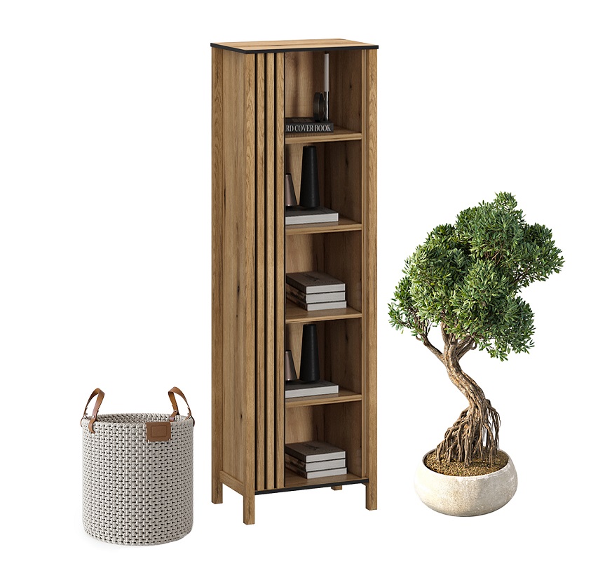 Regał otwarty Helios 10 to wyjątkowe połączenie funkcjonalności i nowoczesnego designu, zapewniające doskonałe miejsce do eksponowania oraz przechowywania. Wykonany z wysokiej jakości płyty meblowej laminowanej, prezentuje się w przyjemnym kolorze dąb evok z matowym wykończeniem, co nadaje mu elegancji i lekkości. Subtelne ryfle na frontach regału dodają delikatnego akcentu, wprowadzając do wnętrza nutę wyrafinowanego wzornictwa.