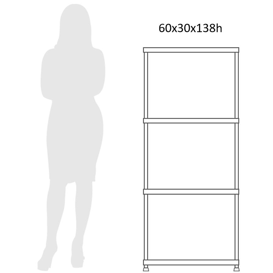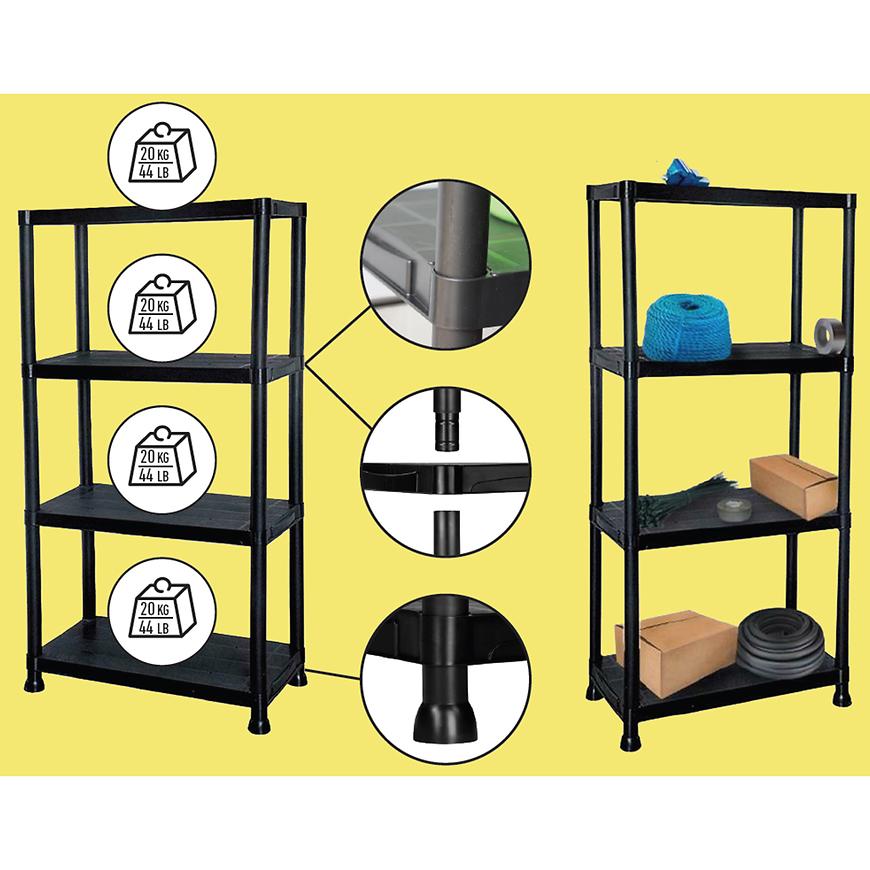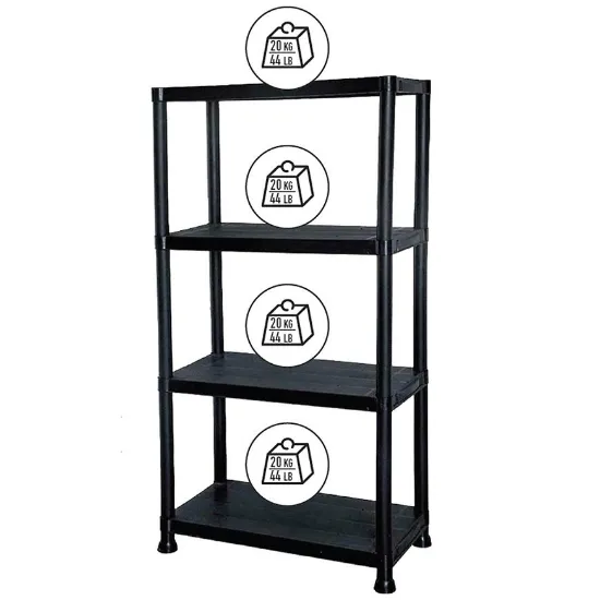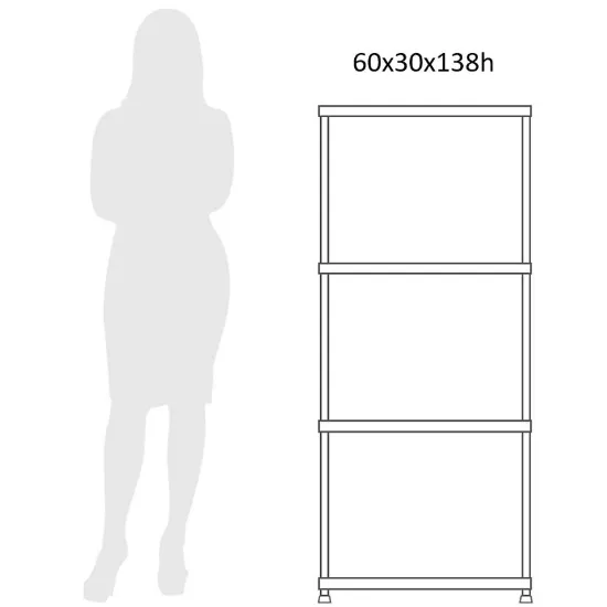 Model T60 wyposażony został w 4 półki wykonane z wytrzymałego tworzywa. Każda z nich posiada maksymalne obciążenie 20 kg, co sprawia, że regał sprawdzi się do przechowywania narzędzi, pojemników, środków czystości, akcesoriów ogrodowych i innych drobnych przedmiotów. Wysokość półki 3,5 cm zapewnia stabilną podstawę, a odpowiednio dobrane rozstawy półek ułatwiają organizację.