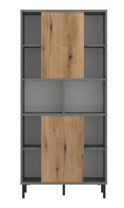 Kolorystyka regału Pozzi 2D łączy w sobie modną szałwiową zieleń i naturalny odcień dębu, co sprawia, że mebel doskonale wpisuje się w aktualne trendy wnętrzarskie. Taka kompozycja barw sprzyja tworzeniu przytulnej, harmonijnej przestrzeni, w której dominuje spokój i elegancja.