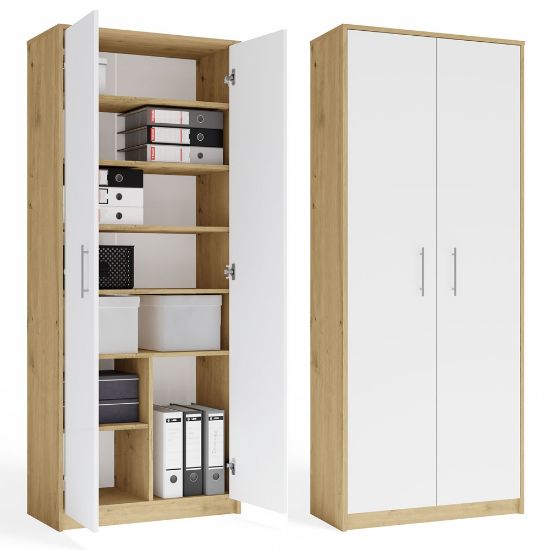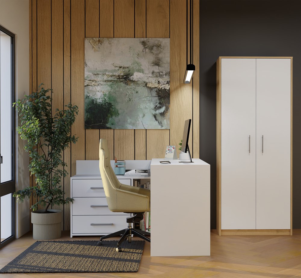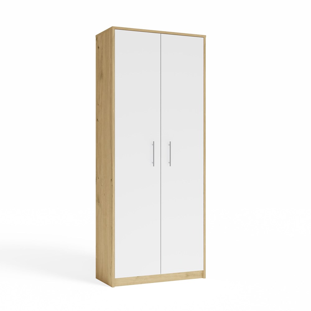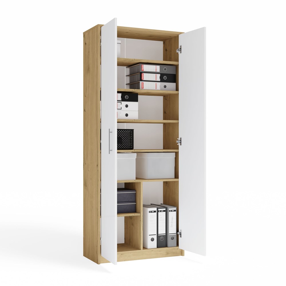 Regał Rado 2D w kolorze dąb artisan z białymi drzwiami to praktyczny i estetyczny mebel, który pomaga utrzymać porządek w każdej przestrzeni. Uniwersalna kolorystyka łączy ciepły odcień naturalnego drewna z elegancką bielą, dzięki czemu regał doskonale komponuje się z aranżacjami nowoczesnymi, skandynawskimi oraz loftowymi. Smukła konstrukcja sprawia, że mebel dobrze wykorzystuje dostępną przestrzeń, oferując dużą pojemność przy zachowaniu lekkiego wyglądu. Regał sprawdzi się jako regał do salonu, regał biurowy, regał na dokumenty lub regał do pokoju dziecięcego i młodzieżowego.