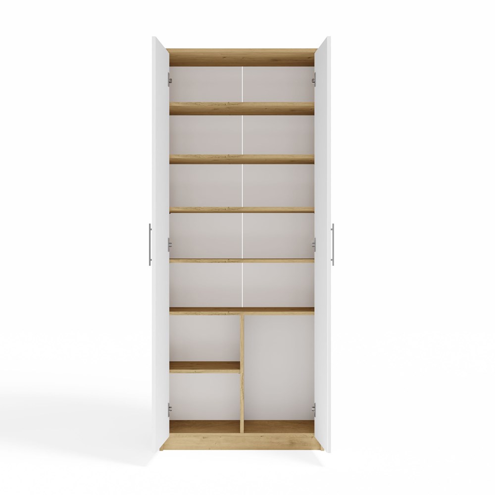 Przemyślany układ wnętrza pozwala na wygodne przechowywanie różnorodnych przedmiotów. Regał wyposażony jest w aż 8 praktycznych półek, które umożliwiają uporządkowanie książek, segregatorów, dekoracji oraz materiałów biurowych. Dwie zamykane drzwi pozwalają ukryć mniej reprezentacyjne elementy, pomagając zachować estetyczny wygląd pomieszczenia. Wygodne uchwyty w kolorze srebrnym ułatwiają codzienne korzystanie z mebla i podkreślają jego nowoczesny styl. Taki układ sprawia, że regał z półkami i drzwiami jest odpowiedni zarówno do przechowywania dokumentów firmowych, jak i domowych akcesoriów.