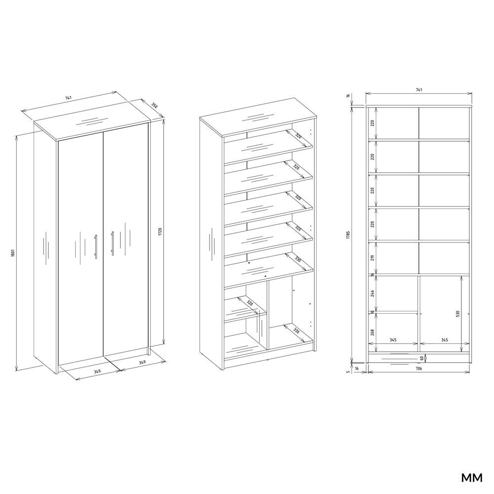 Korpus oraz fronty wykonane zostały z trwałej płyty wiórowej laminowanej o grubości 16 mm. Uchwyty wykonano z wytrzymałego tworzywa sztucznego w kolorze srebrnym, które dobrze współgra z całością konstrukcji. Wymiary regału zapewniają wygodne przechowywanie przy zachowaniu kompaktowej formy. Szerokość mebla wynosi 74 cm, głębokość 35 cm, natomiast wysokość 180 cm, co czyni go praktycznym rozwiązaniem do przechowywania dokumentów, książek oraz elementów dekoracyjnych.