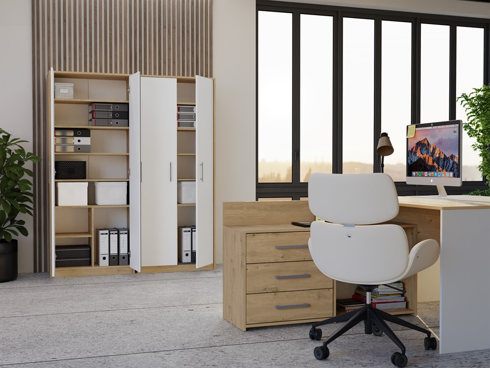 Połączenie dekoru dąb artisan z białymi frontami tworzy harmonijną kompozycję pasującą do wielu aranżacji. Regał może pełnić funkcję biblioteczki w salonie, szafy na dokumenty w biurze, organizera w pokoju młodzieżowym lub miejsca do przechowywania materiałów edukacyjnych w pracowni. Minimalistyczna forma sprawia, że mebel nie przytłacza wnętrza, a jednocześnie stanowi jego praktyczne uzupełnienie. Dzięki swojej wysokości regał pozwala optymalnie zagospodarować przestrzeń pionową, co jest szczególnie istotne w mniejszych pomieszczeniach.