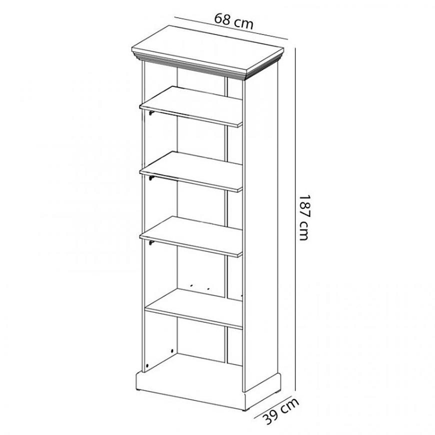 Ten regał o wymiarach 68 cm szerokości, 187 cm wysokości i 39 cm głębokości łączy jasne, naturalne wybarwienie sosny nordyckiej z delikatnym akcentem dębu dzikiego. Matowe wykończenie frontów i korpusu z laminowanej płyty wiórowej nadaje meblowi elegancki, ponadczasowy charakter. Regał z kolekcji ROYAL to praktyczne rozwiązanie do przechowywania, które wymaga samodzielnego złożenia. Brak opcji oświetlenia podkreśla prostotę i klasyczny styl tego mebla, który został zaprojektowany wyłącznie do salonu.