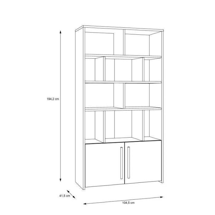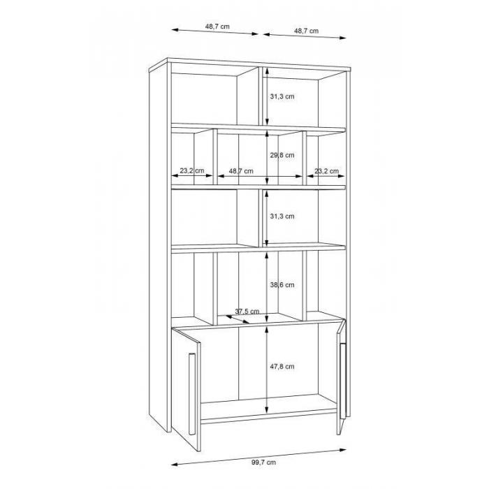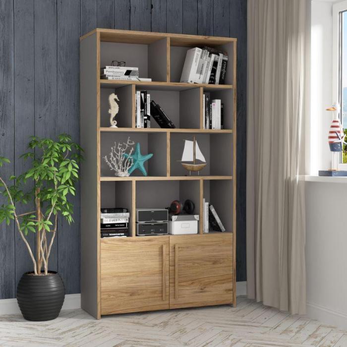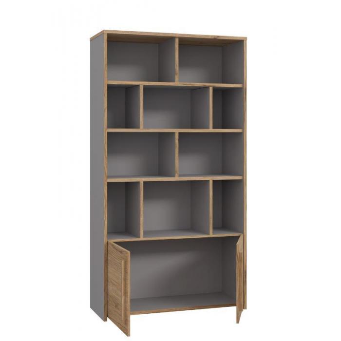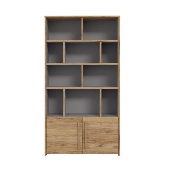 Korpus oraz front regału Soklot wykonane zostały w szarym dekorze w połączeniu z dekorem dąb catania - wykończone folią finish + Folia PP. Regal posiada 10 zewnętrznych półek. Maksymalne obciążenie półek wynosi 10 kg. Uchwyty wykonane z MDF-u w dekorze dąb catania.