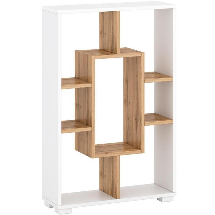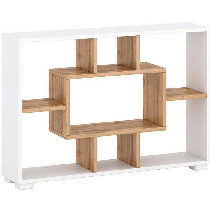Regał Solis 1 biały/wotan to praktyczne i stylowe rozwiązanie do każdego klasycznego wnętrza. Dzięki kompaktowym wymiarom (92,5 × 60,2 × 20,1 cm) świetnie sprawdzi się w salonie, sypialni czy biurze. Korpus wykonany z trwałej płyty wiórowej laminowanej w wybarwieniu biało-drewnianym (wotan) z matowym wykończeniem zapewnia estetyczny wygląd i trwałość użytkowania. Regał nie posiada drzwi ani oświetlenia, co podkreśla jego otwarty, lekki charakter. Należy do kolekcji SOLIS, wymaga samodzielnego montażu i waży 15 kg. Idealny do przechowywania książek, dekoracji i codziennych drobiazgów.