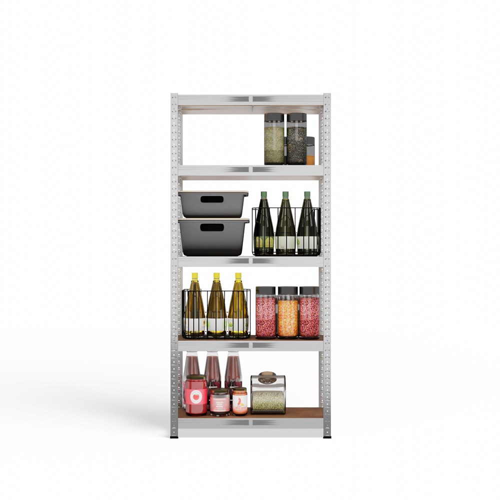 Wyposażony w solidne półki, regał jest w stanie wytrzymać nawet 175 kg obciążenia na każdą z pięciu półek, co czyni go niezwykle funkcjonalnym. Dodatkowe wsporniki oraz grube płyty MDF o grubości 4 mm wzmacniają konstrukcję i zapewniają bezpieczeństwo przechowywanych przedmiotów. Otwory na całej długości nóg umożliwiają dowolną konfigurację półek, co pozwala dostosować regał do indywidualnych potrzeb.
