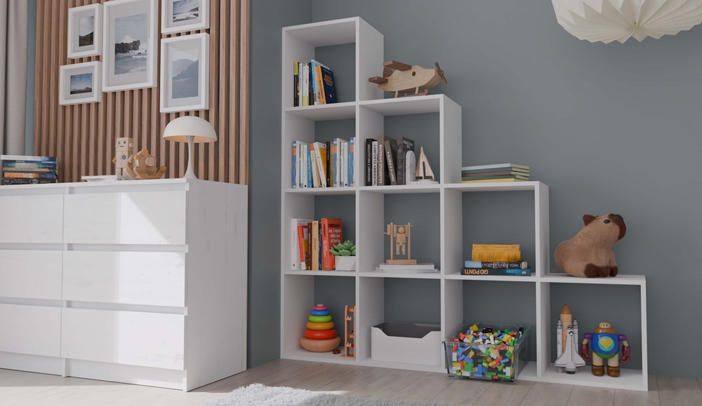 Regał Tipu posiada aż 10 przestronnych komór o wymiarach 36 cm x 36 cm, które pozwalają na wygodną organizację i przechowywanie przedmiotów. Przemyślany układ półek ułatwia uporządkowanie przestrzeni, pomagając zapanować nad porządkiem i jednocześnie eksponując elementy, które zasługują na uwagę. Każda komora oferuje sporo miejsca, umożliwiając przechowywanie przedmiotów różnej wielkości, od książek i segregatorów po ozdobne pudełka czy rośliny.