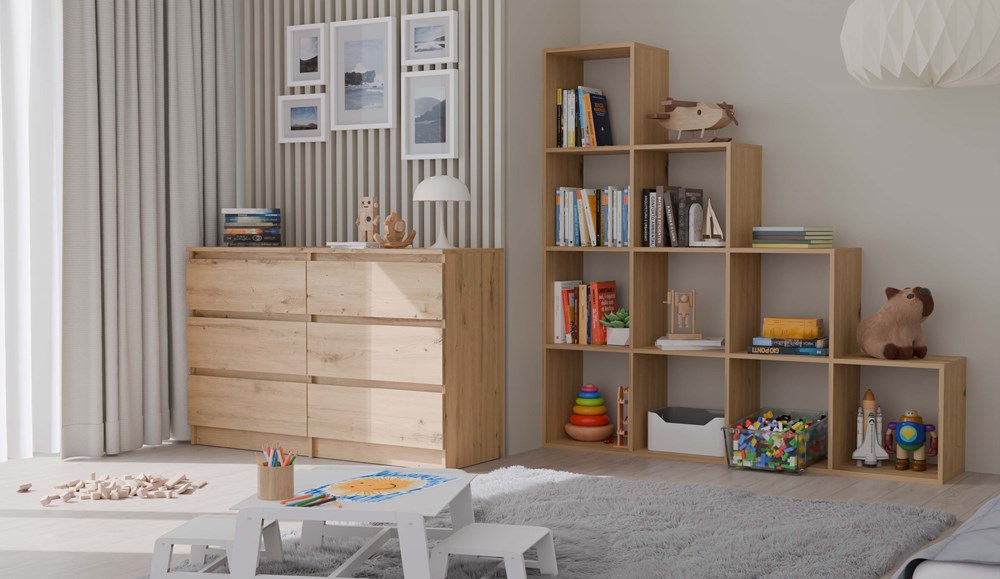 Regał Tipu w kolorze dąb artisan to wszechstronny i stylowy mebel, który świetnie sprawdzi się w każdym pomieszczeniu, nadając mu nowoczesny wygląd i praktyczne walory.
