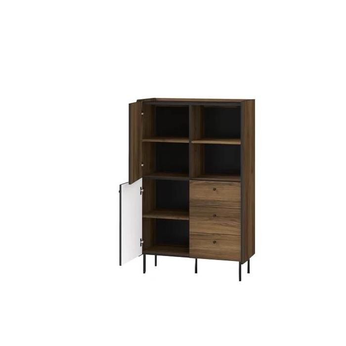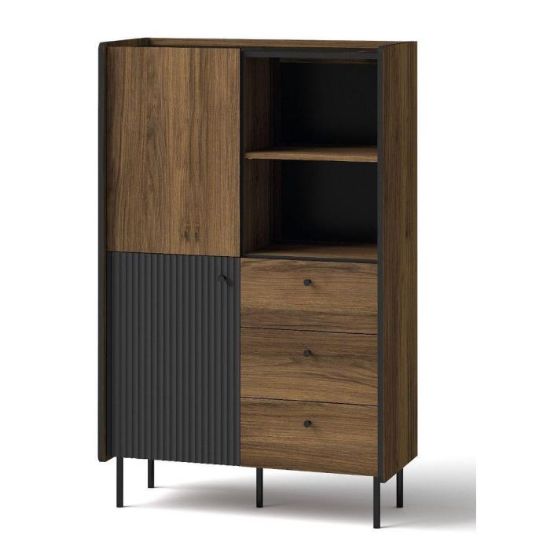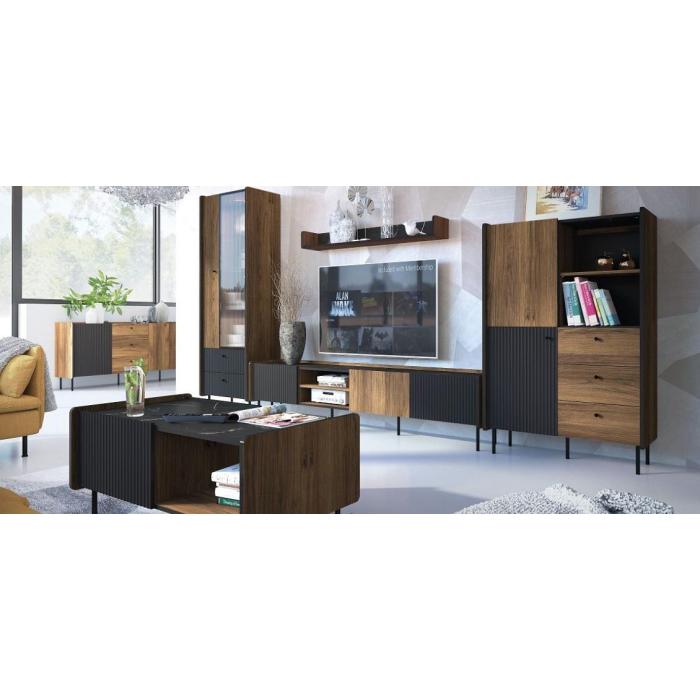 System TIVOLI to nowoczesny system pokojowy w kolorystyce orzech warmia, san sebastian. Na frontach jako element ozdobny zastosowano ryflowane wstawki MDF w kolorze czarnym. Nóżki wykonane z metalu w kolorze czarnym, natomiast uchwyty wykonane zostały z tworzywa sztucznego. Produkt nie posiada oświetlenia LED. Dostępny w paczkach do samodzielnego montażu.