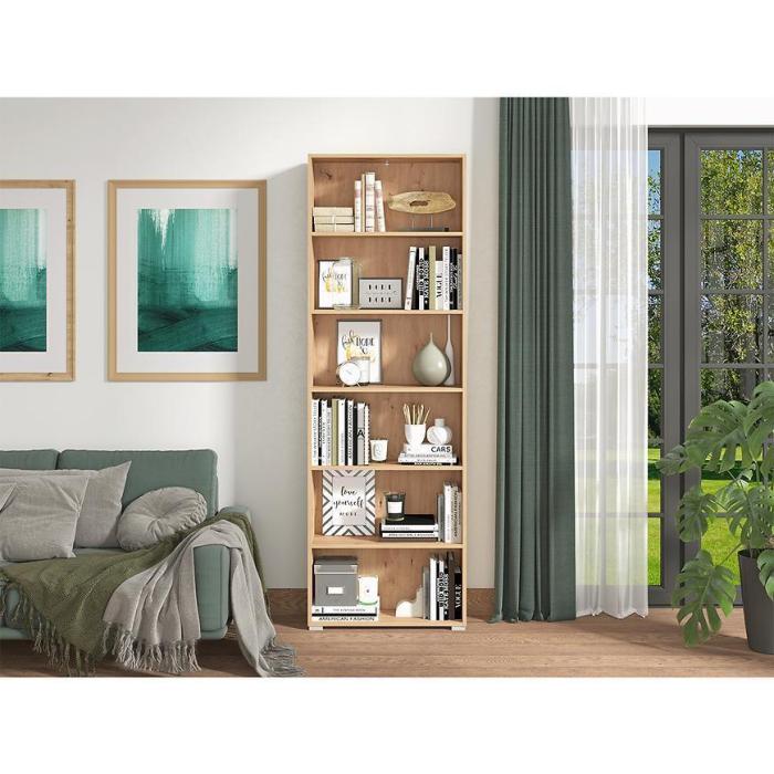 Regały z kolekcji Tomar to uniwersalne, klasyczne bryły, które wpiszą się świetnie w każdą z aranżacji. Regał Tomar wykonany z płyty wiórowej laminowanej nie tylko będzie miejscem na rodzinne pamiątki czy inne ozdoby, ale także praktycznym miejscem do przechowywania np. książek. Regały są pojemne, sprawdzą się zarówno w pokoju nastolatka, salonie czy sypialni.