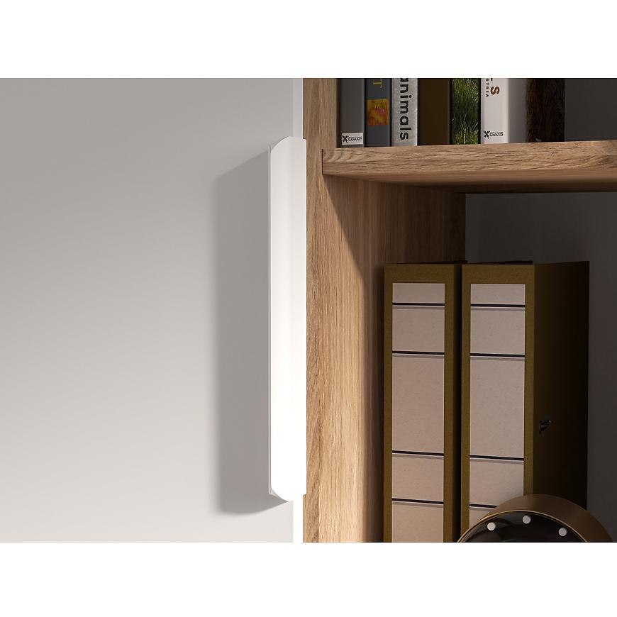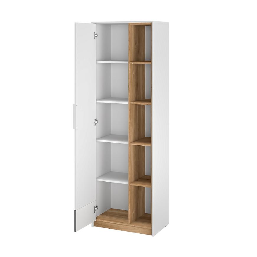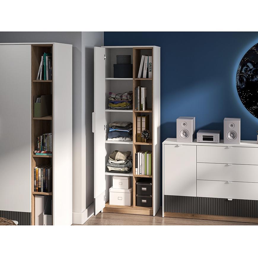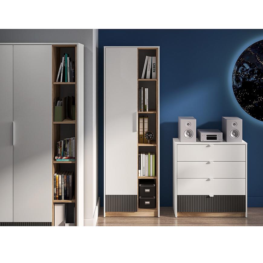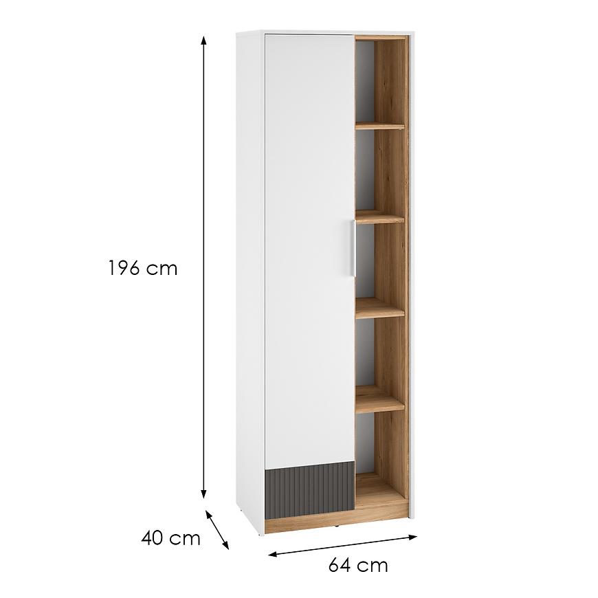 Regał Torino 04 w kolorystyce biały/grafit z elementami dąb castello to stylowe i nowoczesne rozwiązanie do każdego wnętrza. Wysoki na 196 cm mebel oferuje pojemne półki i praktyczne jednodrzwiowe zamknięcie, idealne do przechowywania książek, dokumentów czy dekoracji. Korpus wykonany z laminowanej płyty wiórowej, a fronty z połączenia płyty MDF i wiórowej zapewniają trwałość i elegancki wygląd. Matowe wykończenie dodaje subtelnej elegancji, a kontrastowe kolory wpisują się w nowoczesne aranżacje. Regał wymaga samodzielnego złożenia. Kolekcja: TORINO.