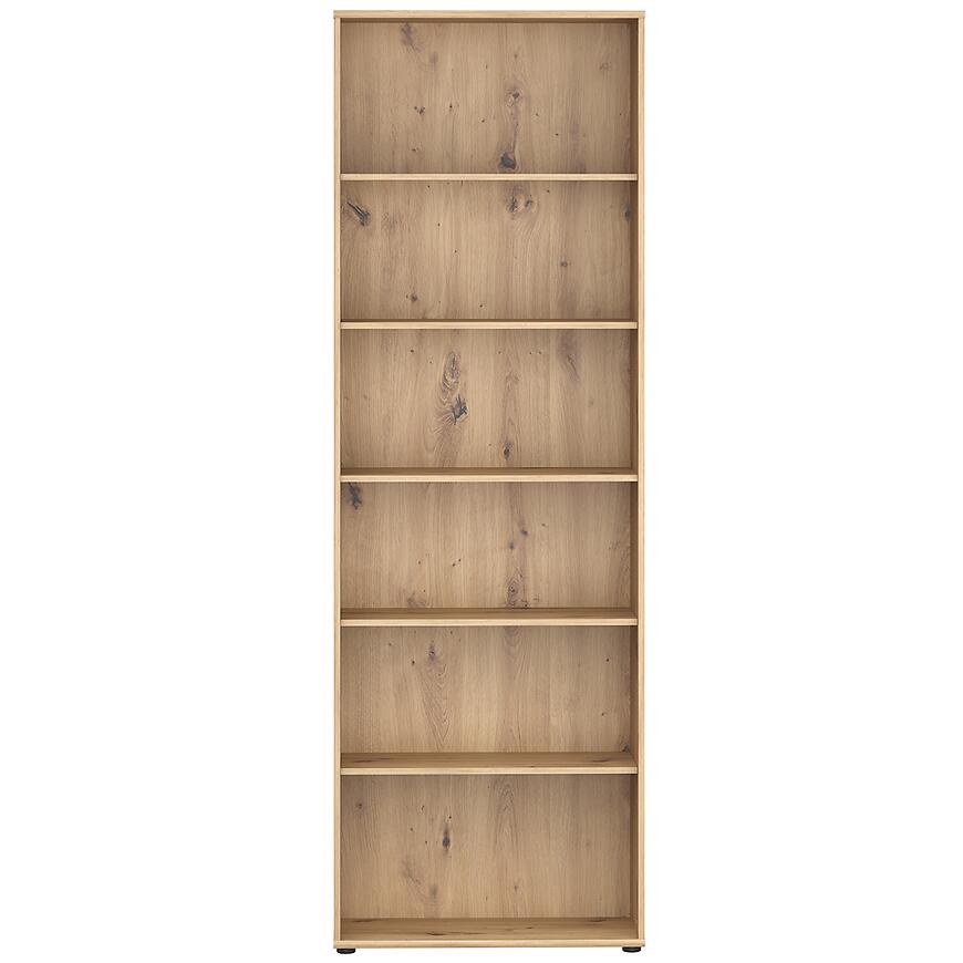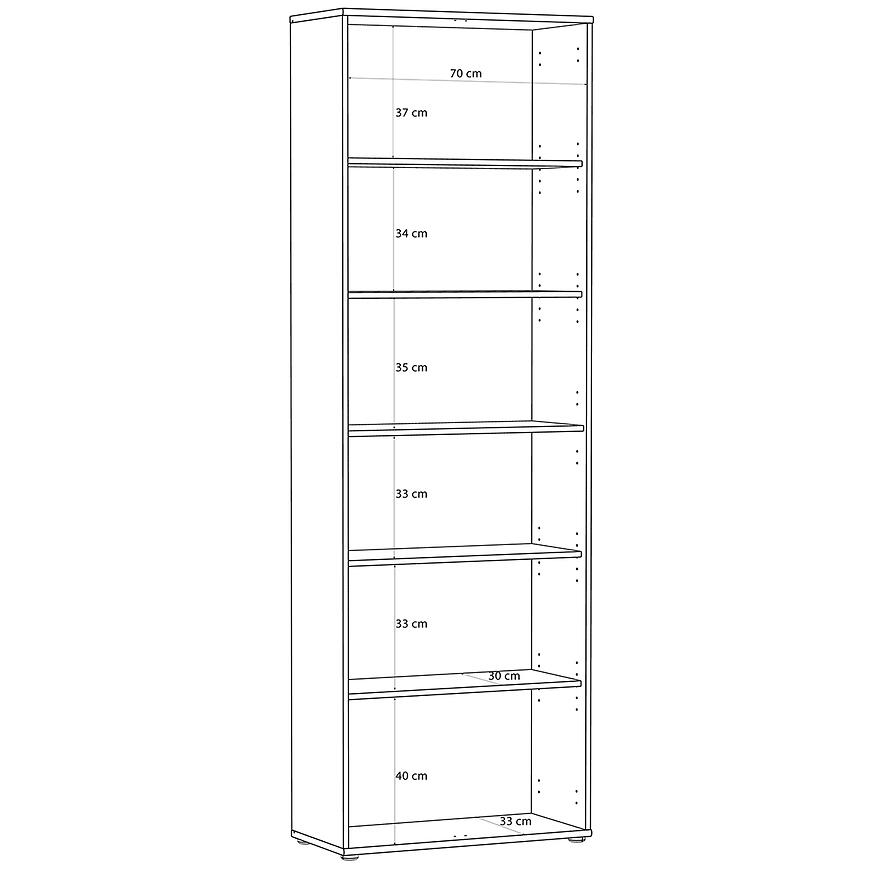 Regał nie posiada drzwi, co umożliwia łatwy dostęp do przechowywanych przedmiotów i pozwala na estetyczną ekspozycję książek, dekoracji, dokumentów czy akcesoriów domowych. Wysokość 223,1 cm i szerokość 73,7 cm gwarantują dużą powierzchnię do przechowywania, a głębokość 34,8 cm sprawia, że mebel jest stabilny i pojemny, nie zajmując przy tym zbyt wiele miejsca w pomieszczeniu. Solidna konstrukcja z laminowanej płyty wiórowej zapewnia trwałość i stabilność, a waga 37 kg świadczy o wytrzymałości regału, który posłuży przez wiele lat.