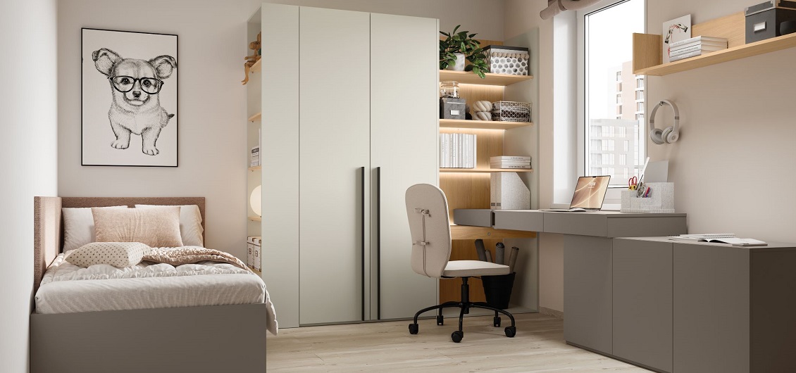 Projektanci kolekcji Woow postawili na ciepłe, stonowane kolory, które tworzą przyjazną bazę aranżacyjną. Dzięki temu pokój łatwo dostosować do wieku dziecka i jego zmieniających się zainteresowań. Neutralne tło pozwala eksperymentować z dekoracjami – plakatami, tekstyliami czy oświetleniem – bez konieczności wymiany mebli.