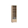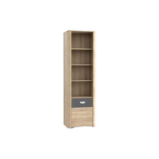 Pojemny regał Yoop YPR 71 to wyjątkowo stylowy dodatek, który sprawdzi się doskonale we wnętrzach urządzonych w stylu skandynawskim, gdzie dominują pozbawione ozdób, drewniane meble o geometrycznych kształtach oraz chłodne, stonowane barwy. Został wykonany z płyty laminowanej o grubości 15 milimetrów w kolorze dębu sonoma z antracytowym elementem. Boczne krawędzie korpusu zostały delikatnie ścięte, nadając całości ciekawego kształtu. Regał Yoop YPR 71 wyposażono w ergonomiczne, srebrne uchwyty dostosowane do kształtu dłoni. W górnej części mebla znajdują się trzy półki, na których doskonale będą wyglądać książki. Dół regału jest zamykany, dlatego można w nim przechowywać różne, nie tylko dekoracyjne przedmioty.