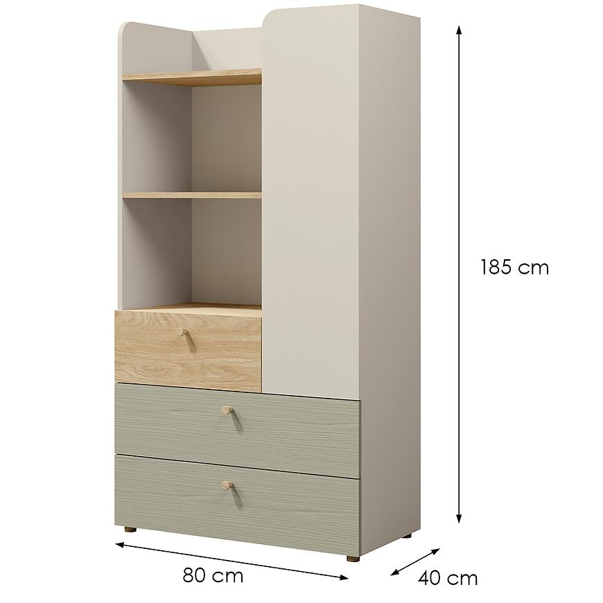 Regał Yuki 6 Eukaliptus/Szary Beż/Dąb Olejowany to nowoczesny, praktyczny mebel idealny do salonu, pokoju dziennego lub pokoju młodzieżowego. Ma wymiary: szerokość 80 cm, wysokość 150 cm oraz głębokość 40 cm, co zapewnia funkcjonalną przestrzeń do przechowywania. Fronty wykonane są z laminowanej płyty wiórowej w kolorach eukaliptusa, szarego beżu oraz dębu olejowanego z matowym wykończeniem. Korpus również jest beżowy z elementami dębu olejowanego, wykończony na mat. Regał posiada jedno drzwi, waży 52,7 kg i wymaga złożenia. Nie jest wyposażony w oświetlenie. Styl mebla jest nowoczesny, co pozwala na łatwe dopasowanie do różnych aranżacji wnętrz.