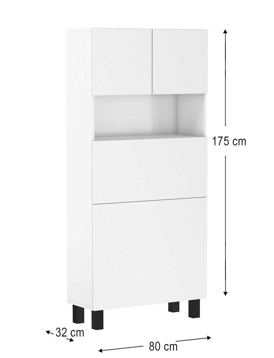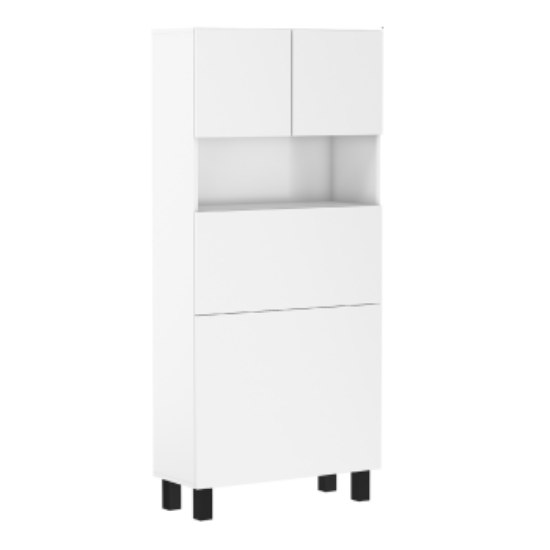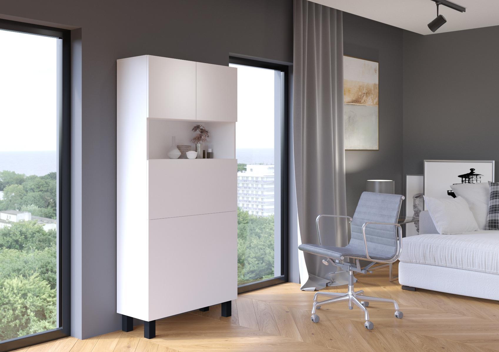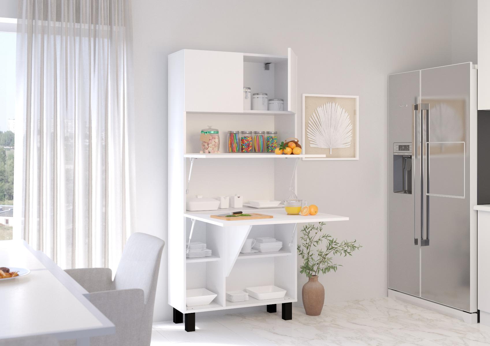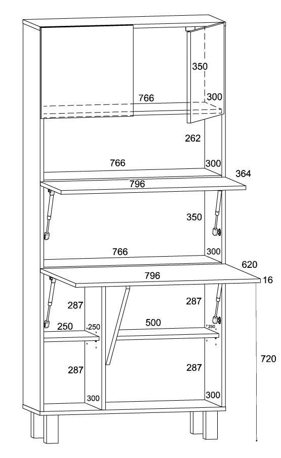 Meble zostały wykonane z płyty wiórowej laminowanej, korpus i front w kolorze białym, dodatkowo obrzeża – wykończone PCV 0,5 mm. Meble mocowany jest do ściany, który posiada gazowe teleskopowe ułatwiające otwieranie i zamykanie do rozkładanych półek, a także zawiasy z cichym domykaniem. Blat po rozłożeniu ma głębokość 92 cm. Zamykana półka górna, 4 półki na dole (zamykane przez blat), dodatkowa rozkładana półka. Obciążenie blatu do 20 kg.