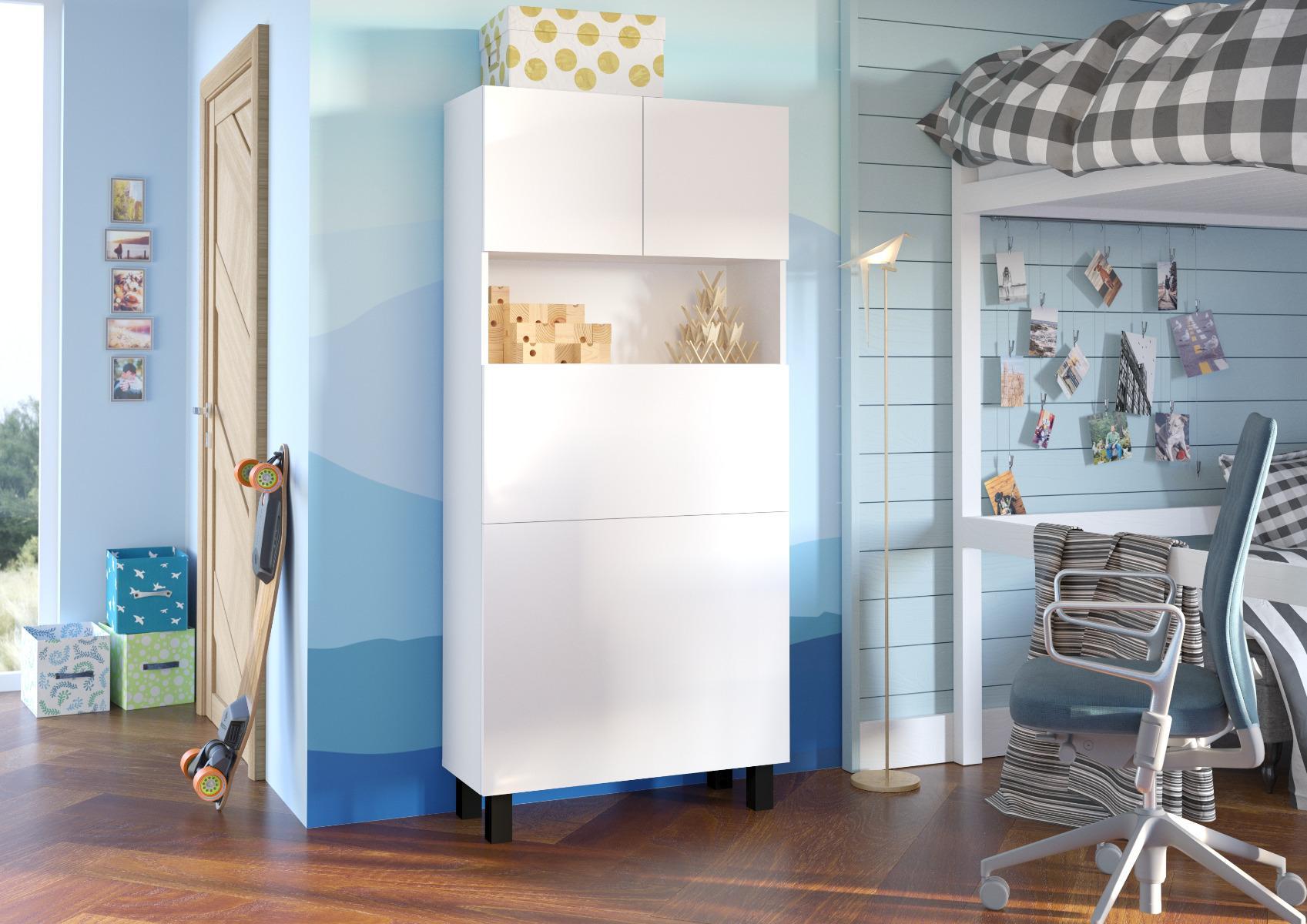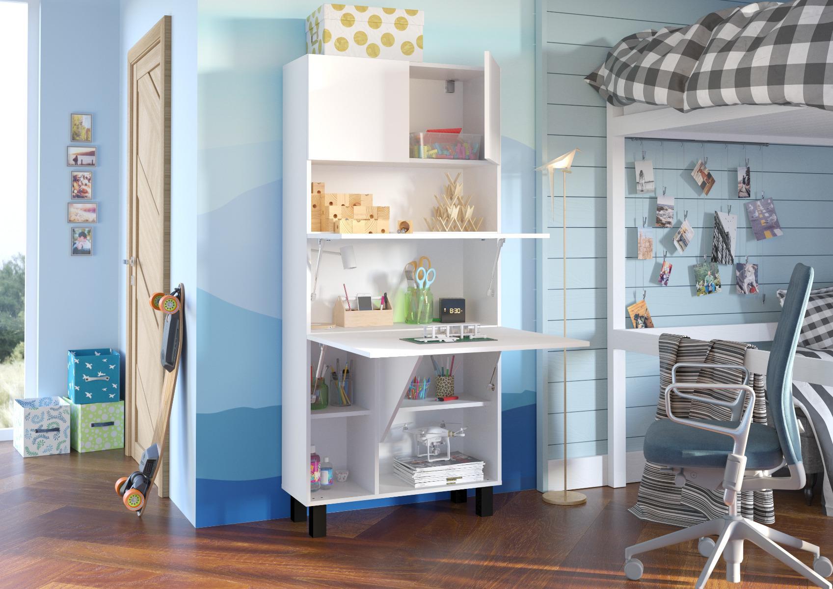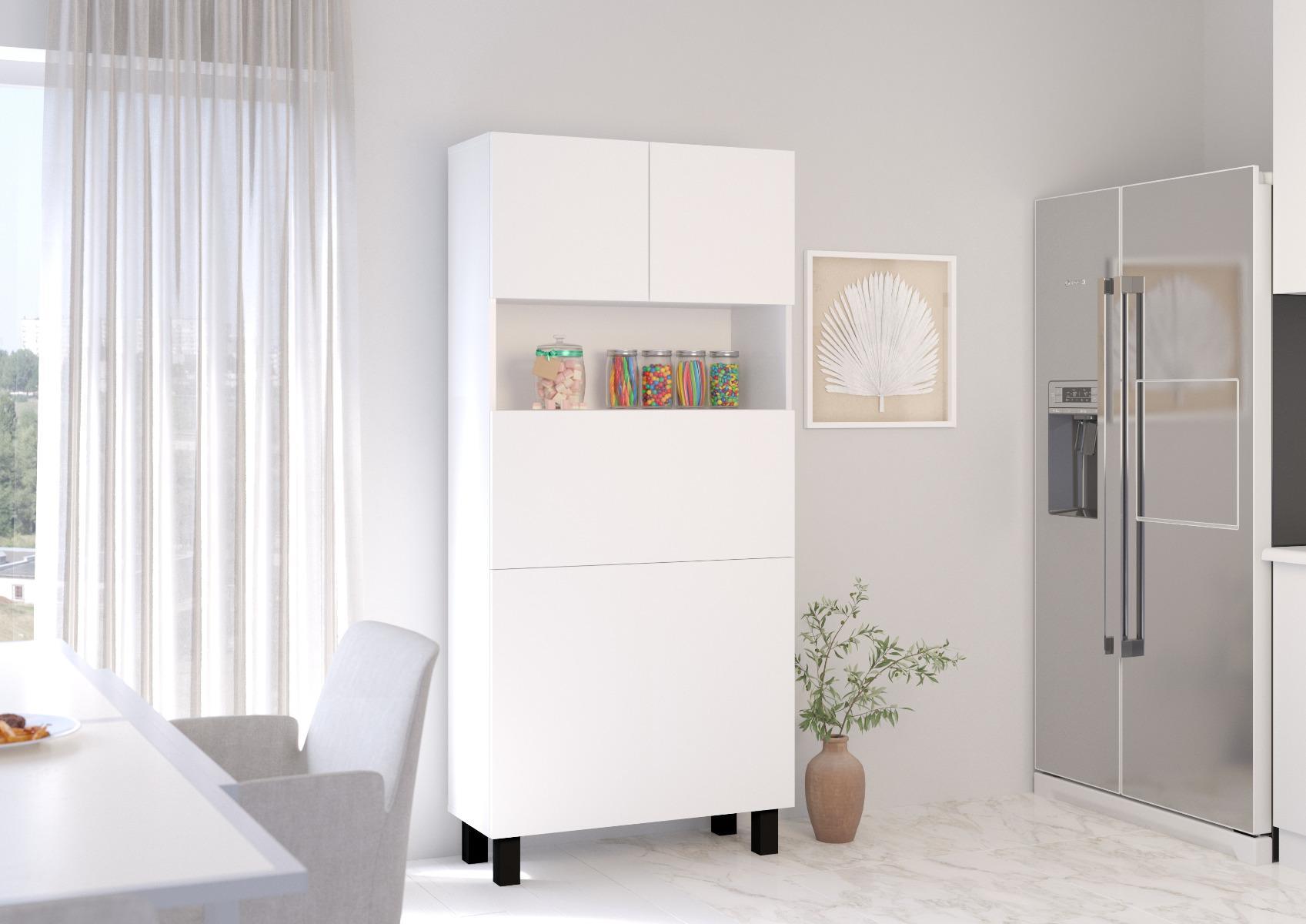 Meble zostały wykonane z płyty wiórowej laminowanej, korpus i front w kolorze białym, dodatkowo obrzeża – wykończone PCV 0,5 mm. Meble mocowany jest do ściany, który posiada gazowe teleskopowe ułatwiające otwieranie i zamykanie do rozkładanych półek, a także zawiasy z cichym domykaniem. Blat po rozłożeniu ma głębokość 92 cm. Zamykana półka górna, 4 półki na dole (zamykane przez blat), dodatkowa rozkładana półka. Obciążenie blatu do 20 kg.