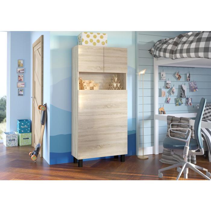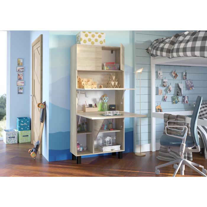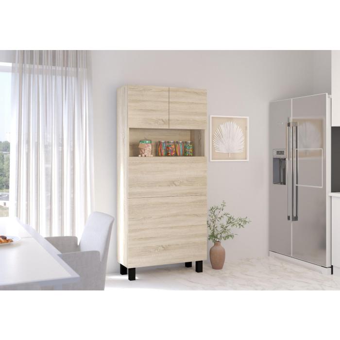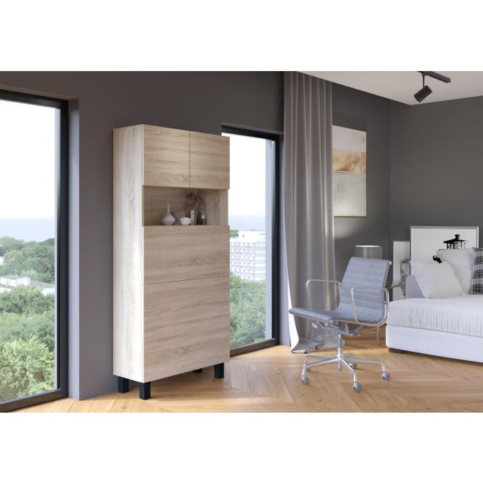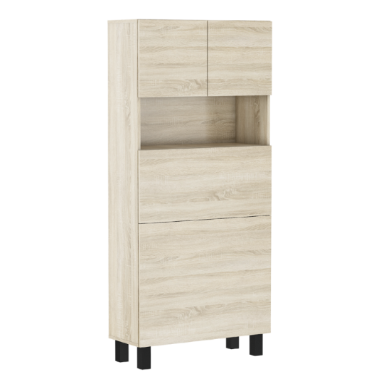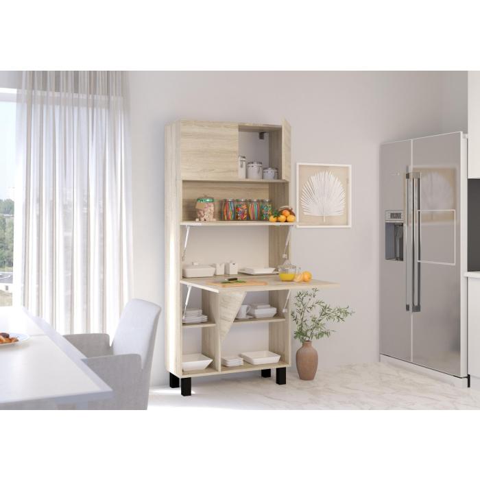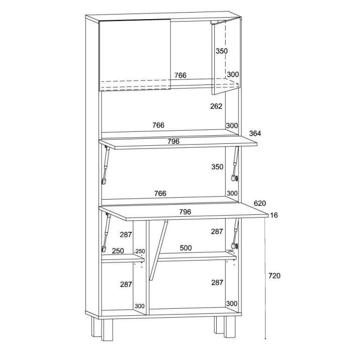 Meble zostały wykonane z płyty wiórowej laminowanej, korpus i front w kolorze dąb sonoma, dodatkowo obrzeża – wykończone PCV 0,5 mm. Meble mocowany jest do ściany, który posiada gazowe teleskopowe ułatwiające otwieranie i zamykanie do rozkładanych półek, a także zawiasy z cichym domykaniem. Blat po rozłożeniu ma głębokość 92 cm. Zamykana półka górna, 4 półki na dole (zamykane przez blat), dodatkowa rozkładana półka. Obciążenie blatu do 20 kg.