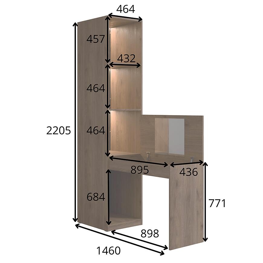 Regał z biurkiem/toaletką Wenecja 25 w kolorze orzech elegant to nowoczesne rozwiązanie łączące funkcję przechowywania z praktycznym miejscem do pracy lub codziennego użytkowania. Smukła, wysoka konstrukcja pozwala efektywnie wykorzystać dostępną przestrzeń, zachowując jednocześnie estetyczny wygląd.
