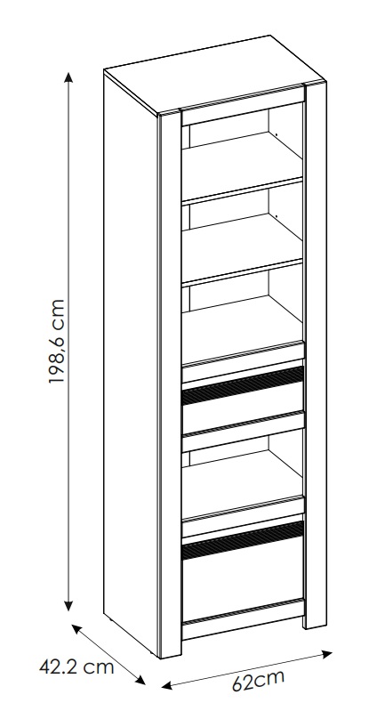 Regał z dwoma szufladami i półkami Novi 2S NVIR01 to połączenie stylowego wzornictwa i praktycznej konstrukcji. Zapewnia dużą ilość miejsca do przechowywania i ekspozycji, a jednocześnie wyróżnia się trwałością oraz ponadczasowym wyglądem, dzięki czemu będzie funkcjonalnym elementem wystroju przez wiele lat.