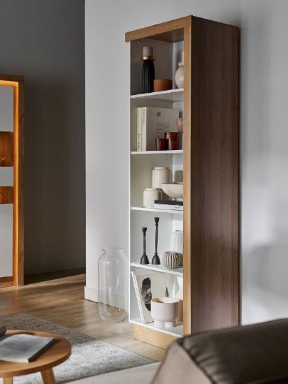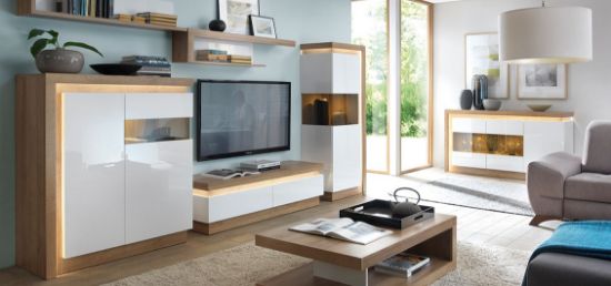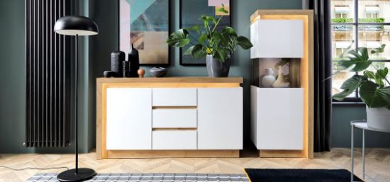 Kolekcja mebli Lyon to propozycja stworzona z myślą o nowoczesnych wnętrzach, które potrzebują subtelnej elegancji i praktycznych rozwiązań. Połączenie ciepłego dekoru dąb riviera jasny z gładkimi frontami w białym połysku to ponadczasowy duet, który doskonale odnajdzie się zarówno w przestronnych salonach, jak i eleganckich jadalniach.