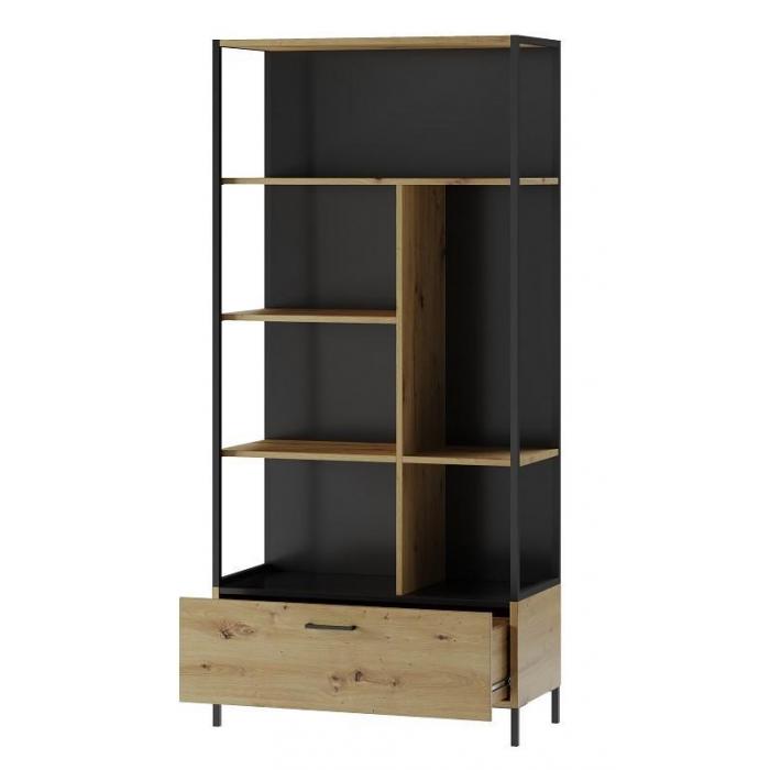 Regał z pojemną szufladą dostępny w kolorze dąb artisan/czarny. Wykonany z płyty meblowej foliowanej. Regał Lumi posiada stabilne metalowe nóżki w kolorze czarnym. Uchwyt szuflady również w kolorze czarnym wykonany został z tworzywa. Regał przeznaczony jest do samodzielnego montażu, pakowany w jedną paczkę.