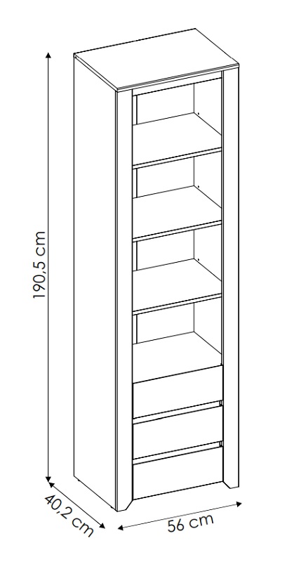 Mebel ma 56 cm szerokości, 190,5 cm wysokości i 40,2 cm głębokości, co sprawia, że jest pojemny, a jednocześnie nie zajmuje dużo miejsca w pokoju. Trzy szuflady w dolnej części regału pozwalają wygodnie przechowywać mniejsze przedmioty, utrzymując porządek w przestrzeni.
