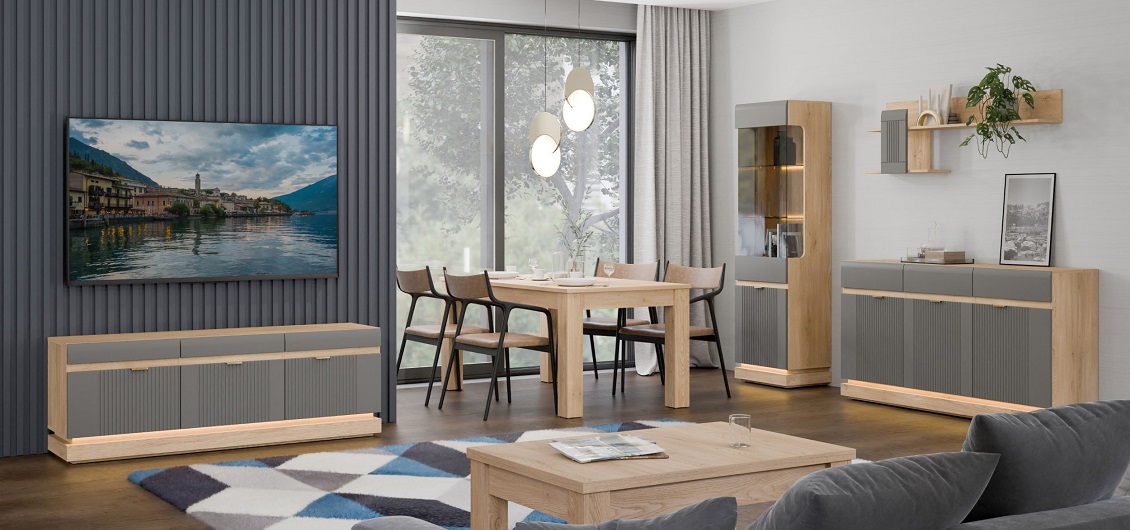 Zróżnicowana oferta elementów w ramach kolekcji Milton pozwala na swobodne komponowanie funkcjonalnych zestawów – od praktycznych komód i przeszklonych witryn po pojemne szafy, łóżka i stoliki RTV. Taka elastyczność umożliwia dopasowanie mebli do metrażu i układu niemal każdego pomieszczenia – zarówno w przestronnych domach, jak i mniejszych mieszkaniach.