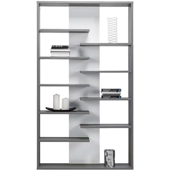 Otwarta konstrukcja regału pozwala na eksponowanie różnych przedmiotów, takich jak pamiątki, książki czy zdjęcia. Biało-szare wybarwienie nadaje minimalistycznego charakteru, który doskonale wpisuje się w obecne trendy meblarskie. Konstrukcja frontów i korpusu opiera się na solidnej płycie wiórowej laminowanej, co gwarantuje trwałość i łatwość w utrzymaniu czystości.