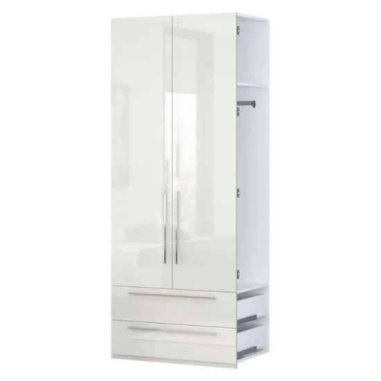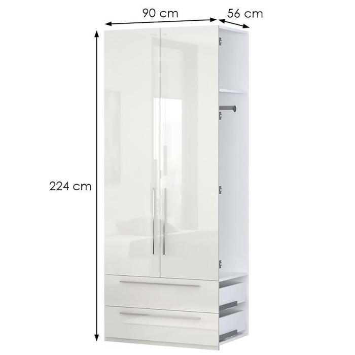 W jej wnętrzu znajdziemy sporo miejsca do przechowywania. Mebel tworzy wygodne miejsce do przetrzymywania odzieży lub dodatków. Wytrzymały materiał, z którego została wykonana szafa oraz ciekawy design sprawdzą się w niemal każdej aranżacji. Szafę wykonano z płyty wiórowej lakierowanej.