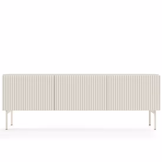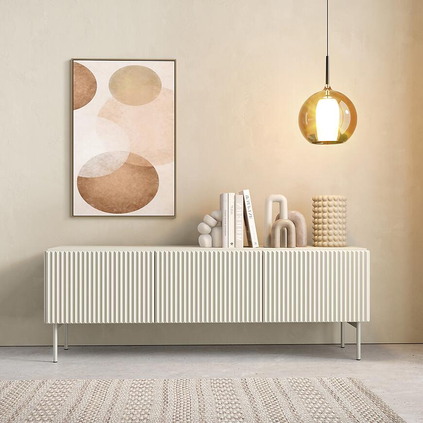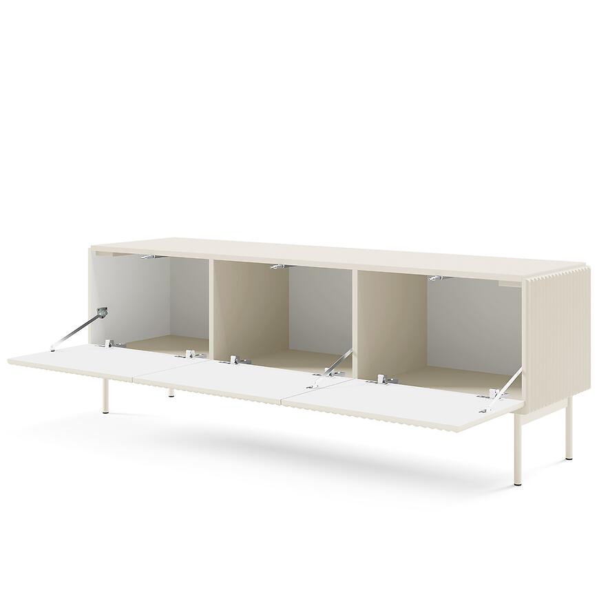 Szerokość 147 cm zapewnia wystarczającą przestrzeń użytkową do ustawienia sprzętu RTV i przechowywania akcesoriów. Trzydrzwiowa konstrukcja umożliwia wygodny dostęp do wnętrza mebla oraz logiczne podzielenie przestrzeni, a jednolite fronty podkreślają minimalistyczny charakter bryły.