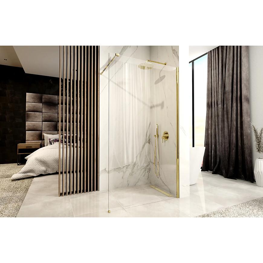 Profil ścianki ma piękny złoty odcień, który nadaje całości luksusowy wygląd, a zarazem doskonale wpasowuje się w różne aranżacje łazienek. Otwarty rodzaj profilu umożliwia regulację na profilu przyściennym, co ułatwia dostosowanie ścianki do konkretnego pomieszczenia.